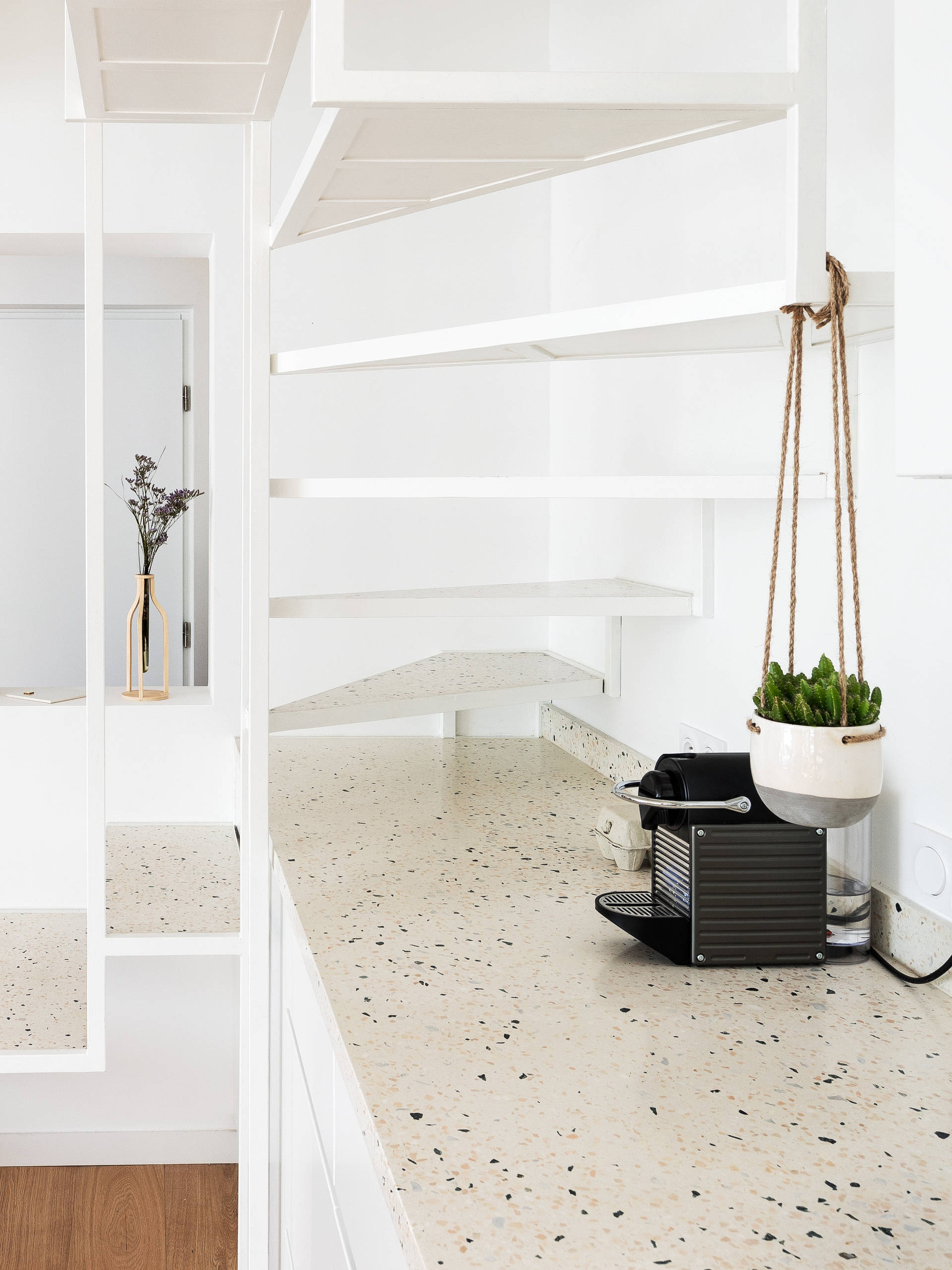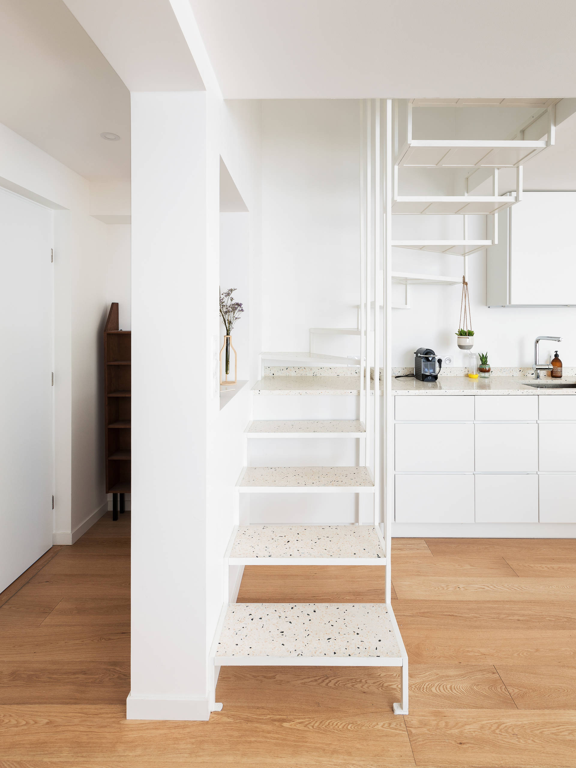 Les marches de escalier, tout comme le plan de travail de la cuisine, ont été réalisées sur mesure en terrazzo. Dessiné par l’agence Arnaud & Delrue, l’escalier a ensuite été réalisé par un serrurier tandis que le terrazzo a été conçu par une entreprise spécialisée avant d’être coulé et poncé sur place.