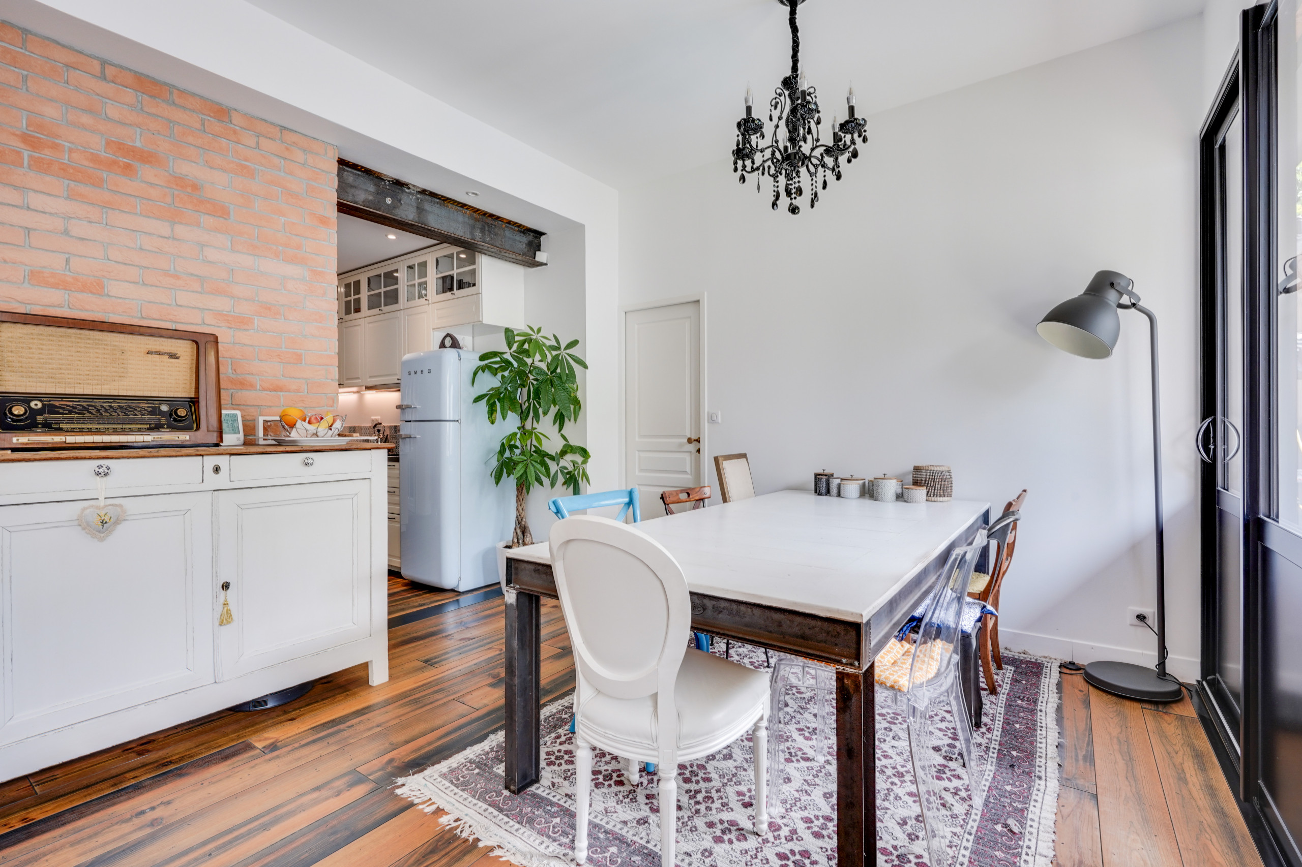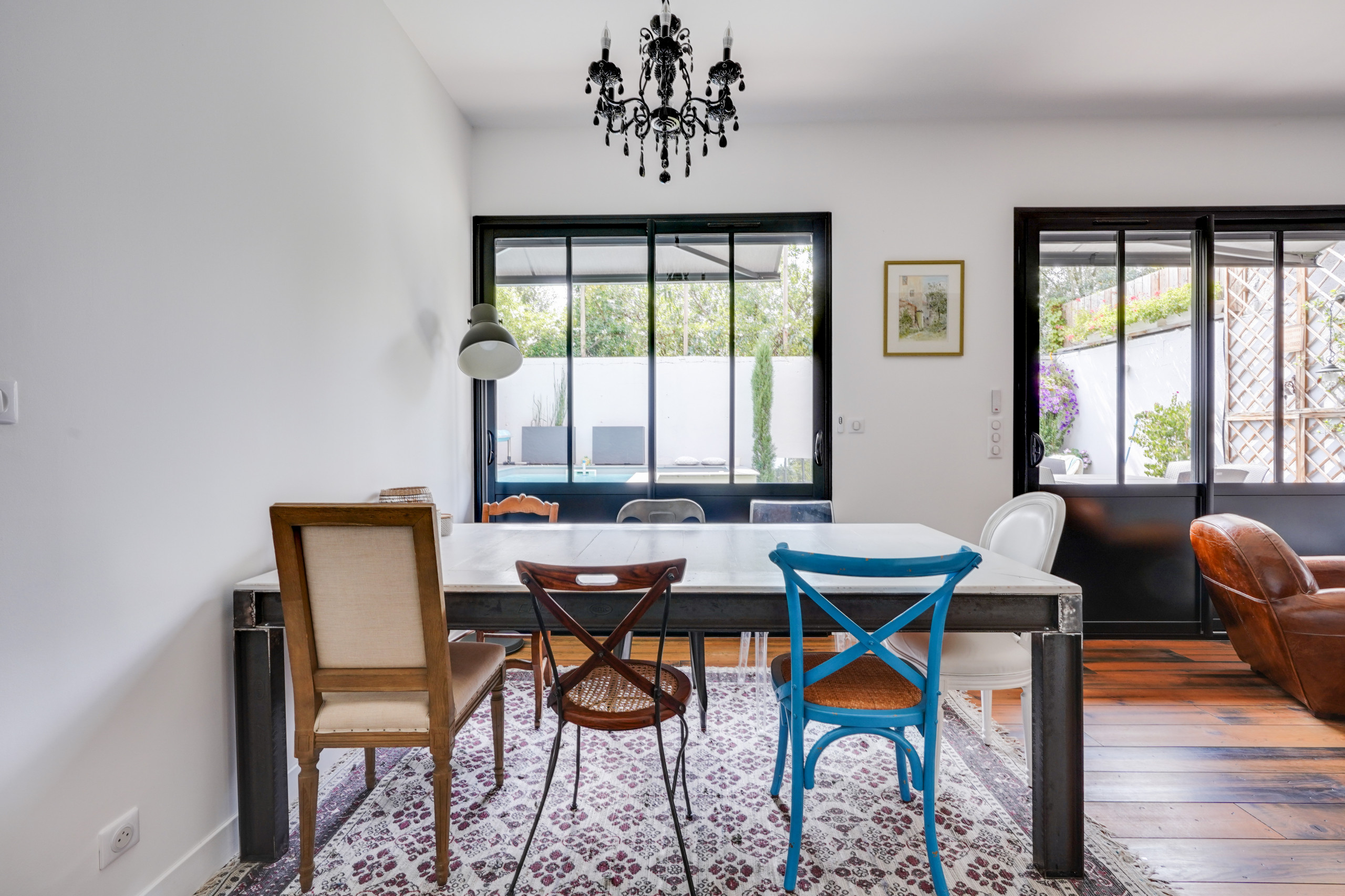 La bonne idée : dépareiller les chaises ! Dans ce type d’intérieur privilégiant les pièces chinées et industrielles, cela ajoute du caractère à la déco.