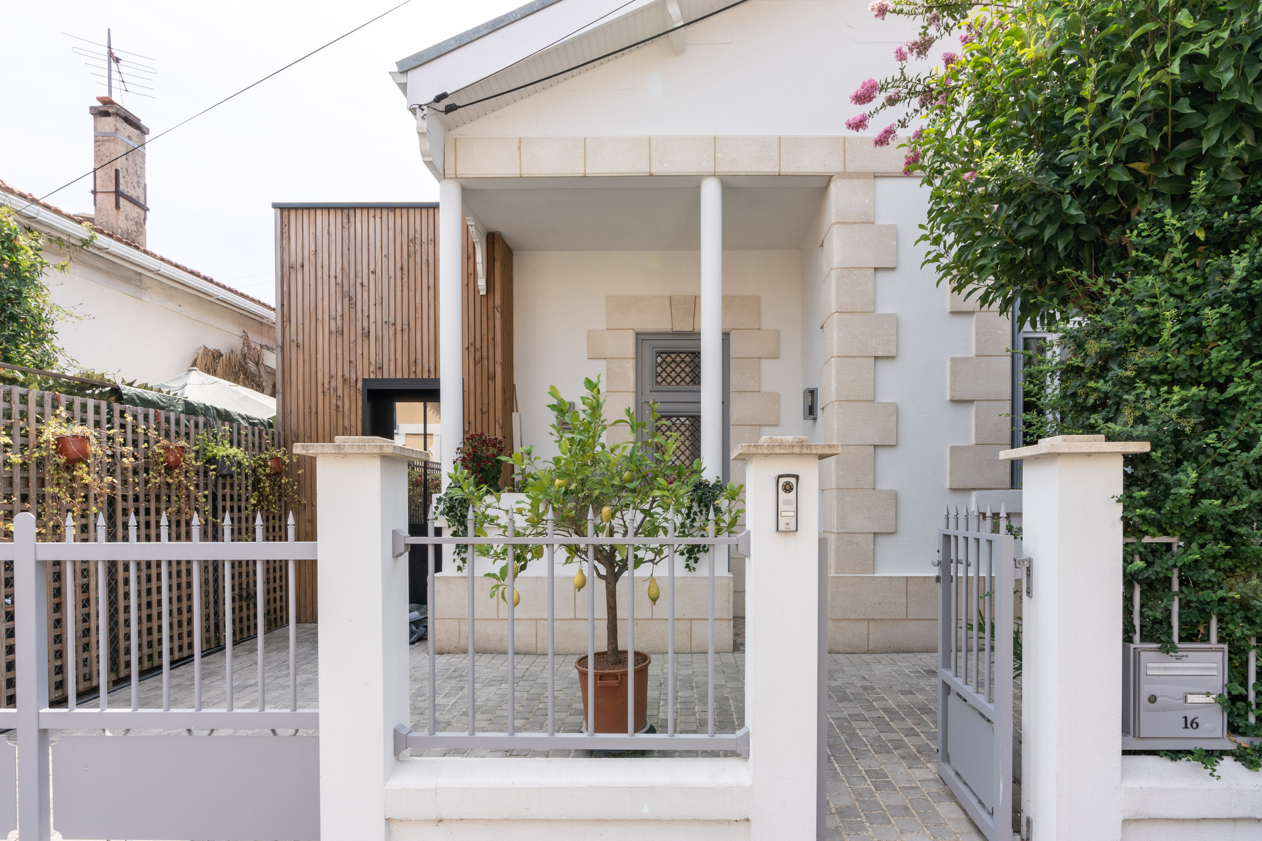 « Cette maison est située dans une petite rue qui abritait autrefois les maisons des chauffeurs de bus de la ville de Bordeaux, raconte Caroline Pierson. Cette rue est composée de petites maisons de style arcachonnais dont les caractéristiques principales sont la façade en pignon, les grandes avancées de toit et les pierres. Nous avons donc articulé les transformations en conservant la façade. » Une partie des pierres a été remplacée, avec de la pierre naturelle de Brétignac. Sur le côté, on aperçoit l’une des extensions qui abrite un nouveau bureau.