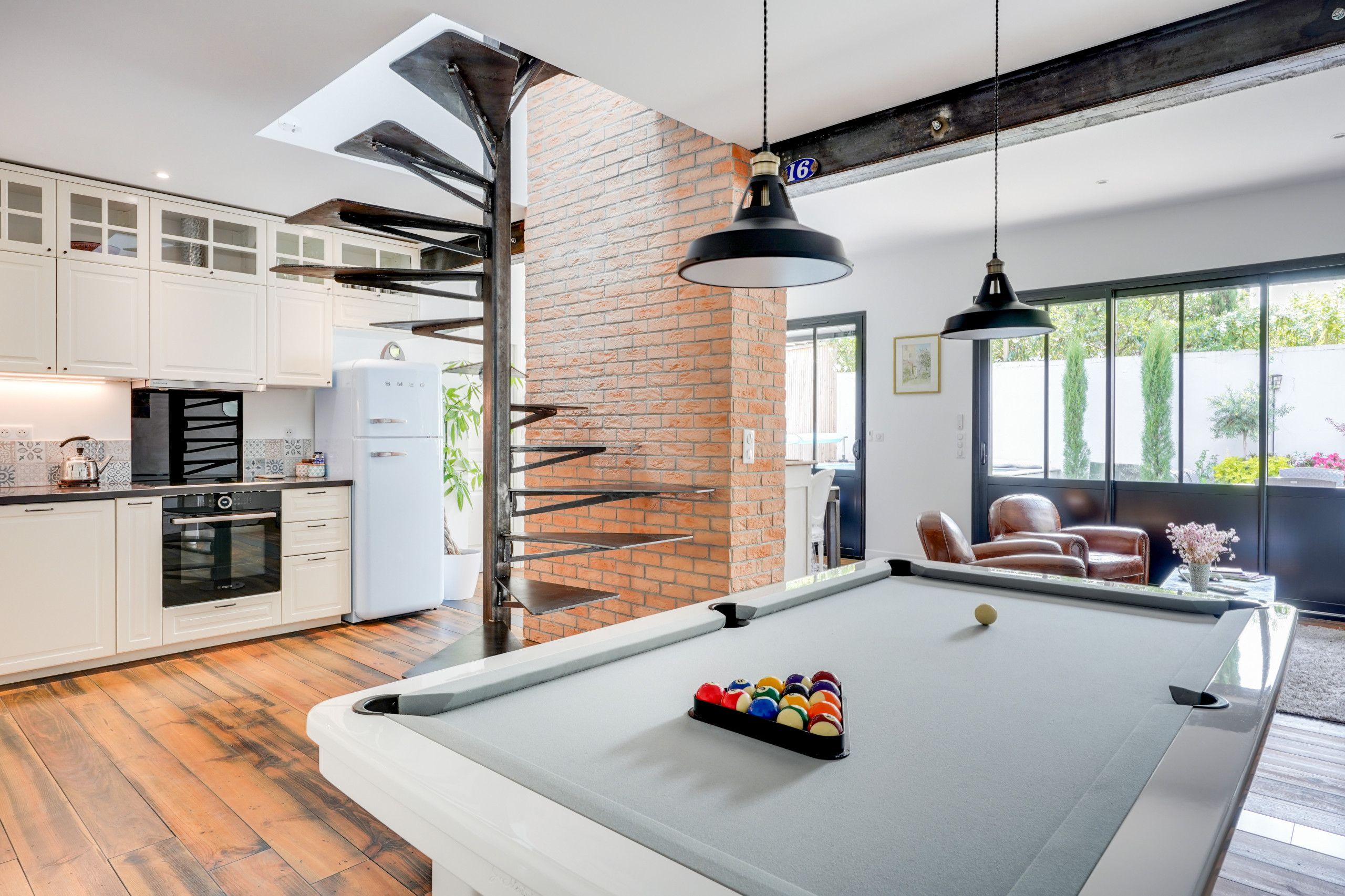 L’IPN en métal marque la séparation entre la partie ancienne et l’extension. Pour suggérer ce style industriel, un escalier sur mesure dans le même matériau, point central de la pièce de vie, a été choisi pour relier les étages. Un parement de briques habille désormais ce mur. Au-dessus du billard, les suspensions évoquent elles aussi cette âme industrielle. La cuisine a été repensée, tout comme le sol recouvert d’un parquet en pin massif posé sur un solivage avec des lattes un peu martelées et noircies, finition endommagée.