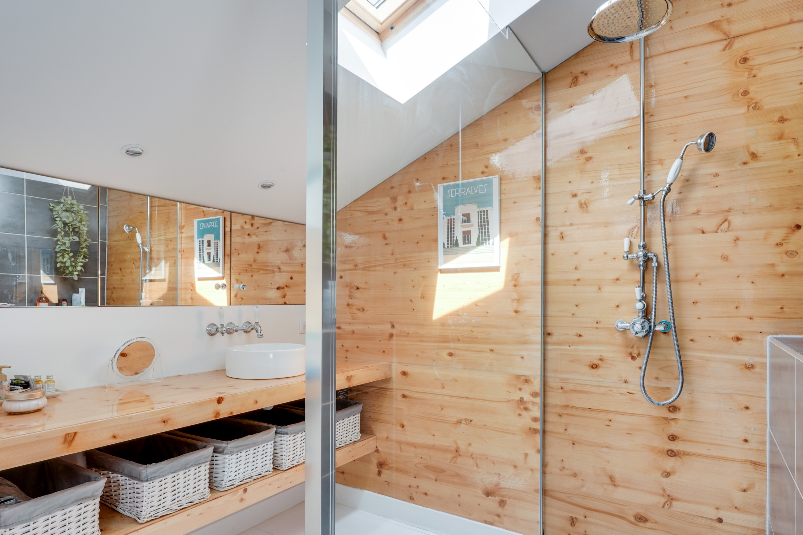 Le bois confère de la chaleur à la pièce. Et même dans la salle de bains où il a été recouvert d’une résine incolore pour l’étanchéité. Dans la même essence – le pin –, le meuble vasque tout simple, composé de des planches et deux vasques, a été fabriqué sur mesure par Ossacasa.