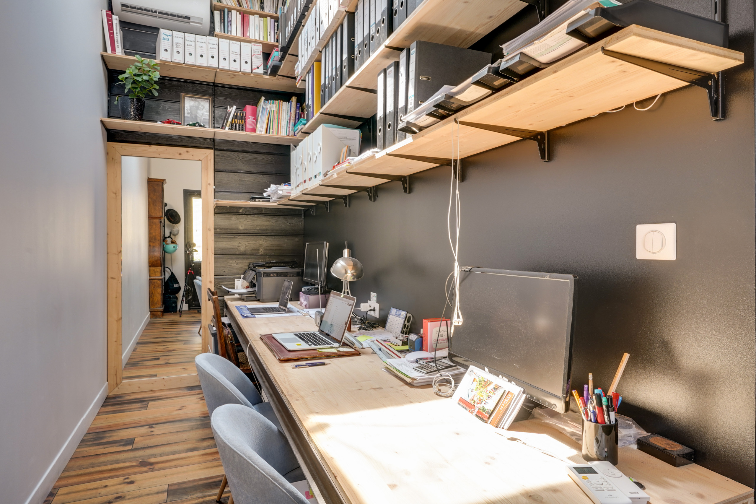 « L’agrandissement sur le côté de la maison a permis de créer un bureau tout en longueur, mais très ergonomique », poursuit Caroline. Pourvu d’une belle hauteur et lumineux grâce à sa fenêtre de toit, le bureau bénéficie de deux postes pour les propriétaires qui travaillent chez eux. Il jouit de nombreux rangements faciles à mettre en place : des planches en pin reconstitué supportées par des équerres en métal sur rails. Un procédé simple à monter, à démonter et peu onéreux. Murs blancs et paroi recouverte d’un bardage noir au fond complètent le décor.