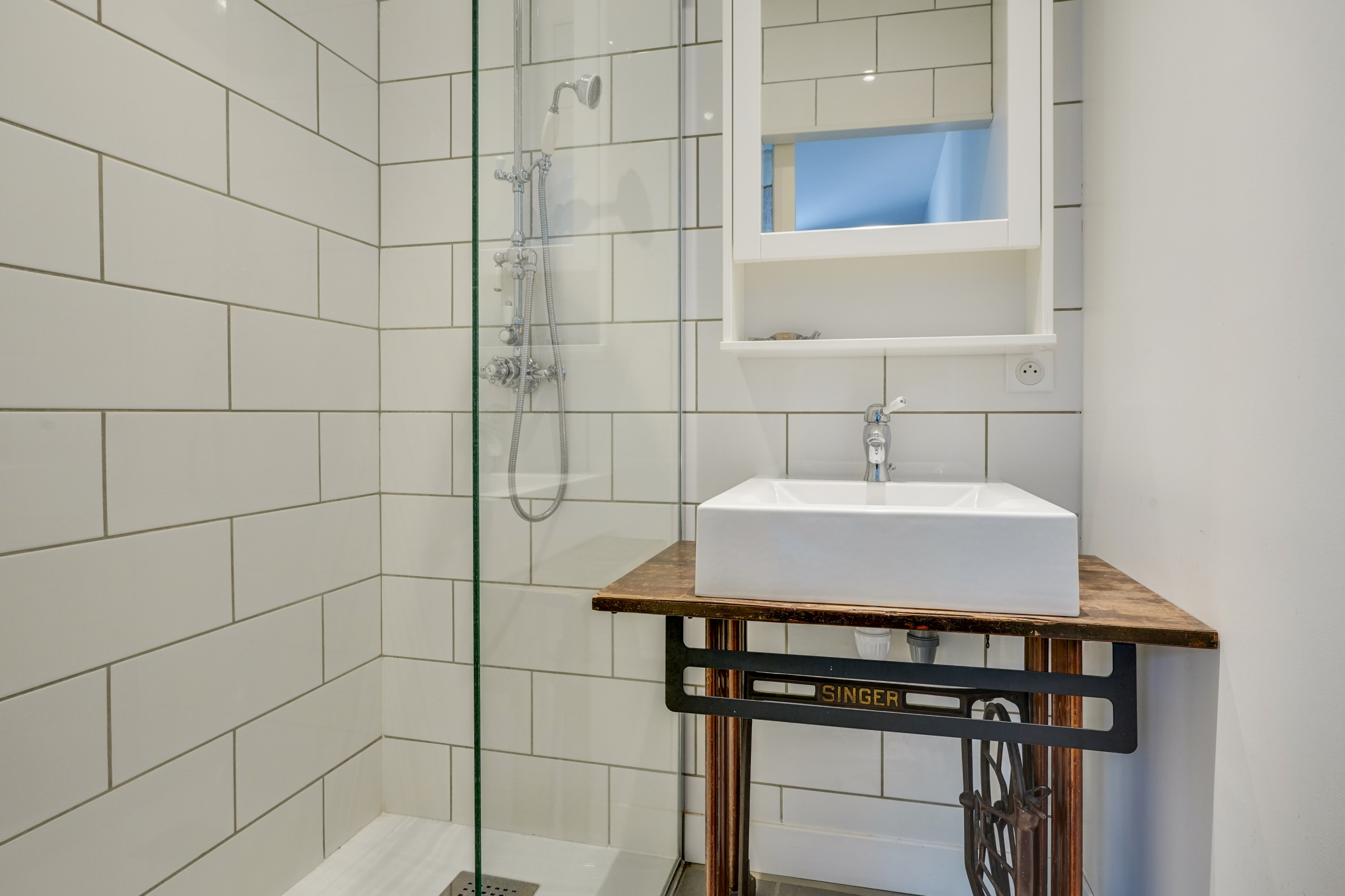 Au rez-de-chaussée, près de la salle TV, qui fait également office de chambre d’amis, une petite salle d’eau a été imaginée. Son meuble vasque demeure singulier : une vieille machine à coudre Singer récupérée sert de socle à la vasque en céramique.