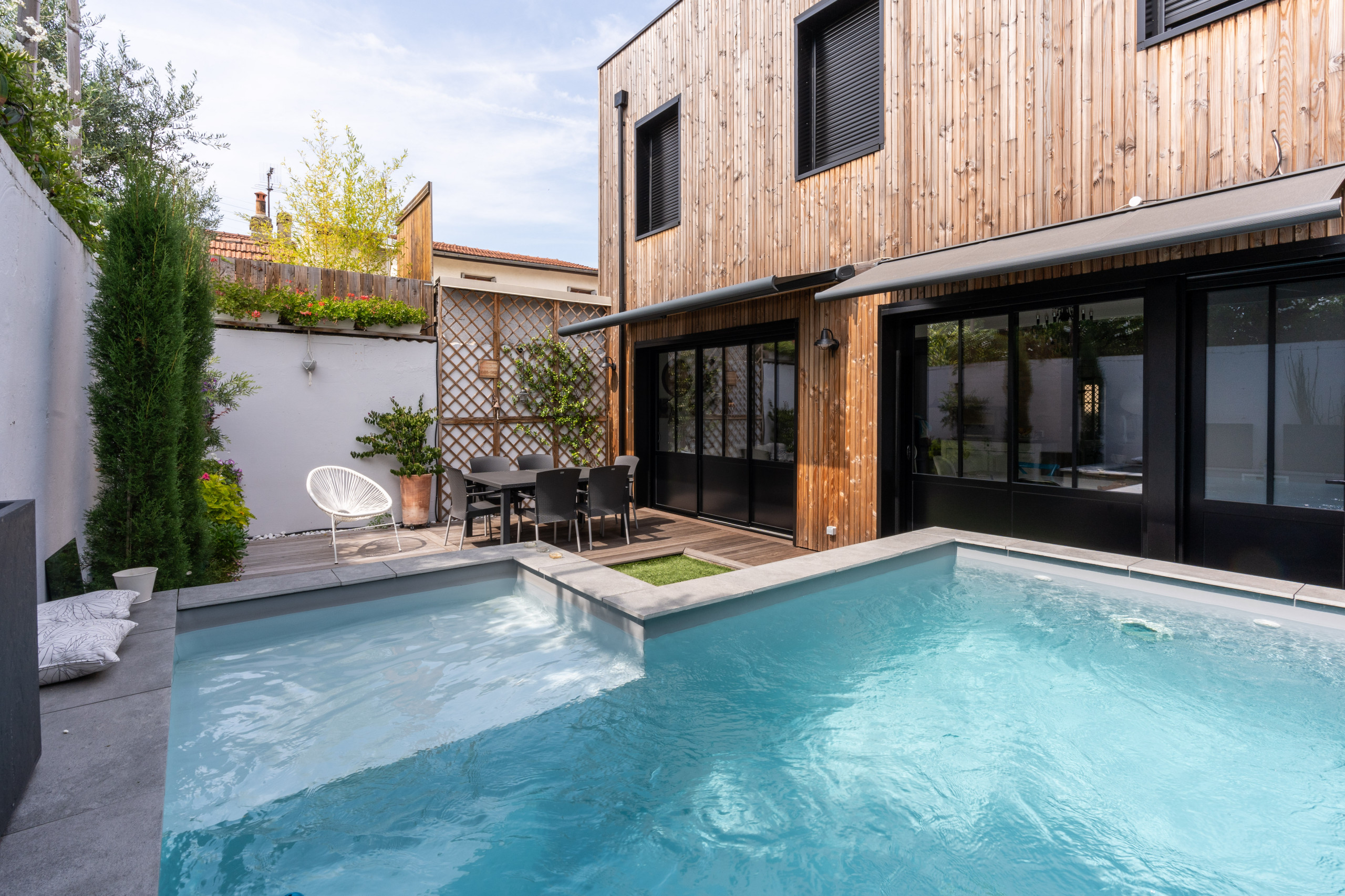 À l’arrière, l’extension de 70 m², enveloppent le au rez-de-chaussée et l’étage, confère un nouveau look à la maison. Elle bénéficie désormais d’un petit jardin de ville paysager et d’une piscine en L semi-enterrée, pratique pour s’asseoir et sécurisant pour les enfants, de moins de 10 m². Terrasse en bois exotique, de l’itauba, et mur végétal apportent une touche très nature, et un coin repas permet à la famille de profiter des belles journées.