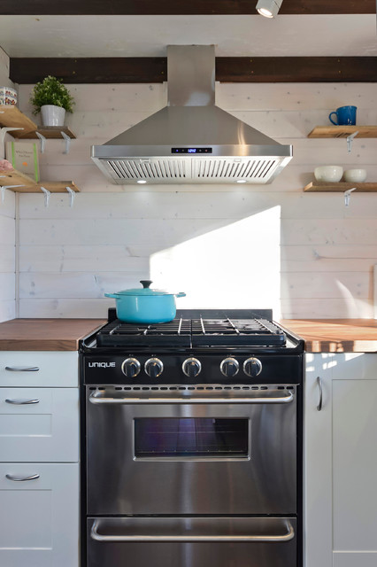 La gazinière au propane de 75 centimètres est signée Unique. Elle est conçue pour être installée dans des endroits sans alimentation électrique classique. L’eau de la maison provient du réservoir de 375 litres mentionné plus haut. Toutes les maisons de l’entreprise sont livrées avec différents branchements pour les eaux grises et noires. Les propriétaires ont ainsi la possibilité de se connecter à n’importe quelle fosse septique sur place. L’eau passe par un tuyau de jardin. L’entreprise Mint installe également des réservoirs d’eau de pluie pour les endroits non connectés à un réseau.