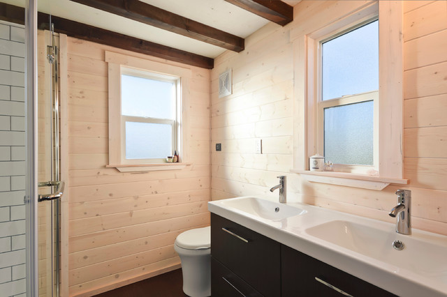 Les murs en pin blanchi, les poutres apparentes et le meuble vasque double donnent du caractère à la salle de bains.