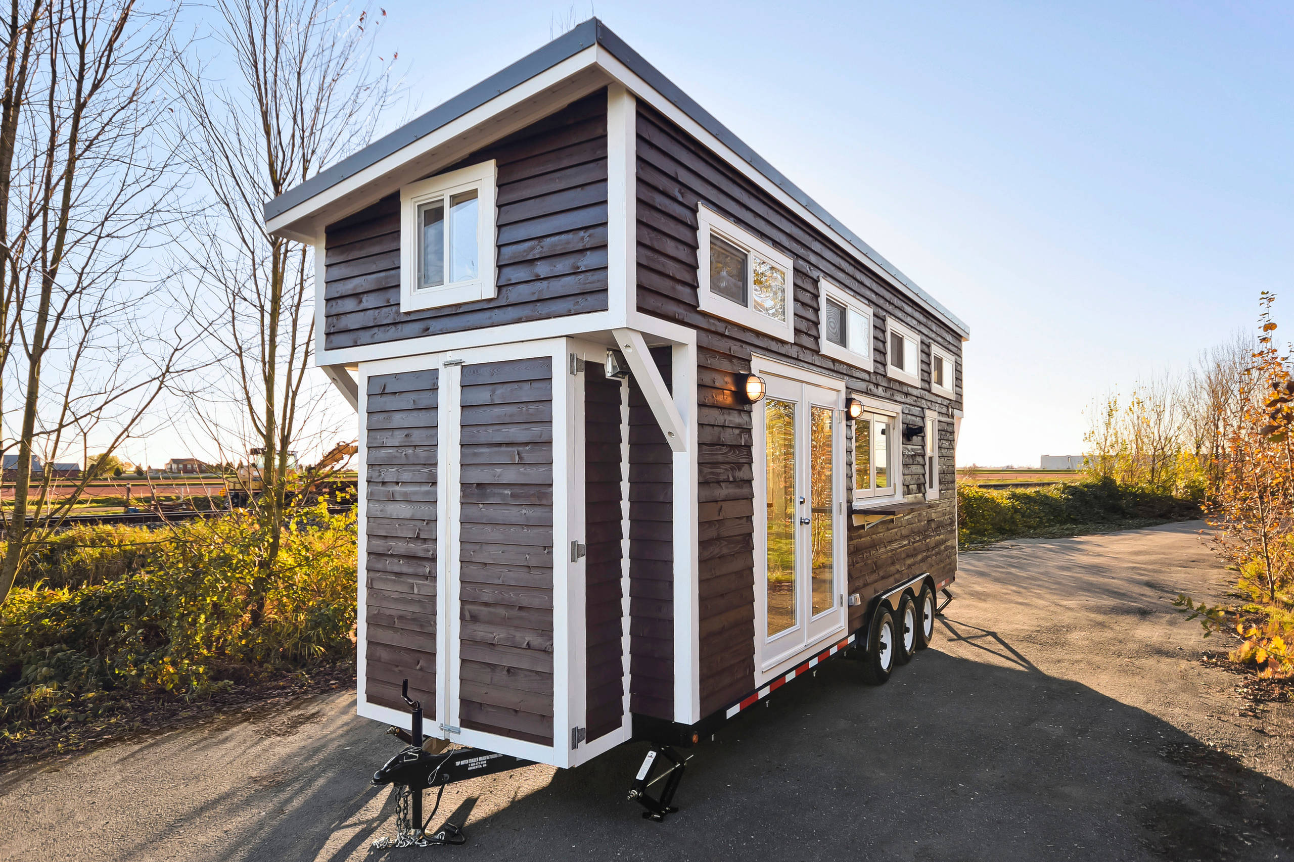 Recouvert d’une teinture foncée, le revêtement extérieur est fait de cèdre cultivé au Canada. Les garnitures, elles, sont peintes en blanc. Les portes-fenêtres et les appliques de style industriel ajoutent du caractère à la façade de la maison. Le placard à l’arrière accueille entre autres un chauffe-eau instantané au propane et un réservoir d’eau de plus de 375 litres. Il est équipé de prises électriques.