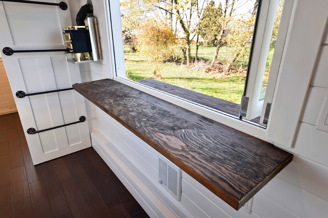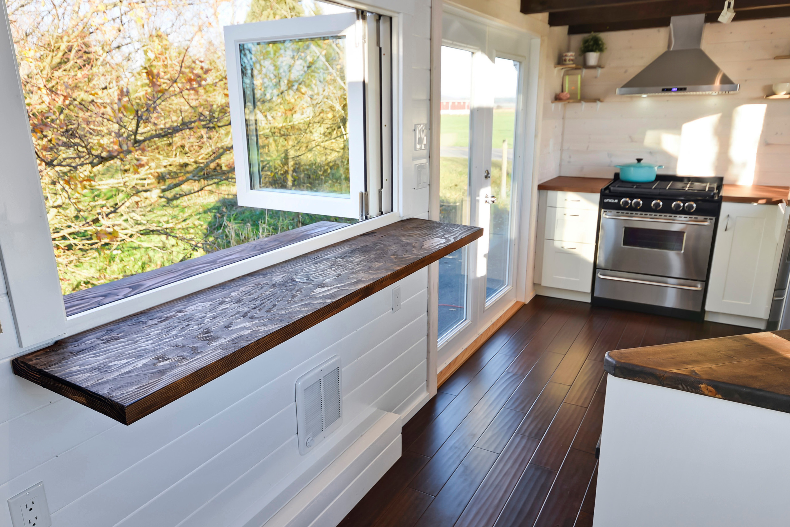 La fenêtre et la table de bois escamotable sont des options choisies par les propriétaires. Il y a une autre table à l’extérieur, sous la fenêtre, amovible plutôt que pliante. Le couple a aussi ajouté une plateforme afin que les invités puissent s’asseoir. Un radiateur mural électrique est situé sous la table.