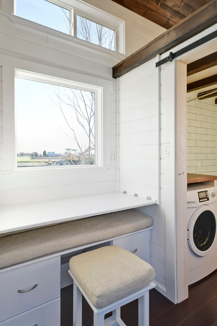 Le lave-linge séchant, signé Midea, occupe peu d’espace dans la salle de bains. Shannon précise que Mint propose aussi des tiny houses équipées d’un modèle LG.