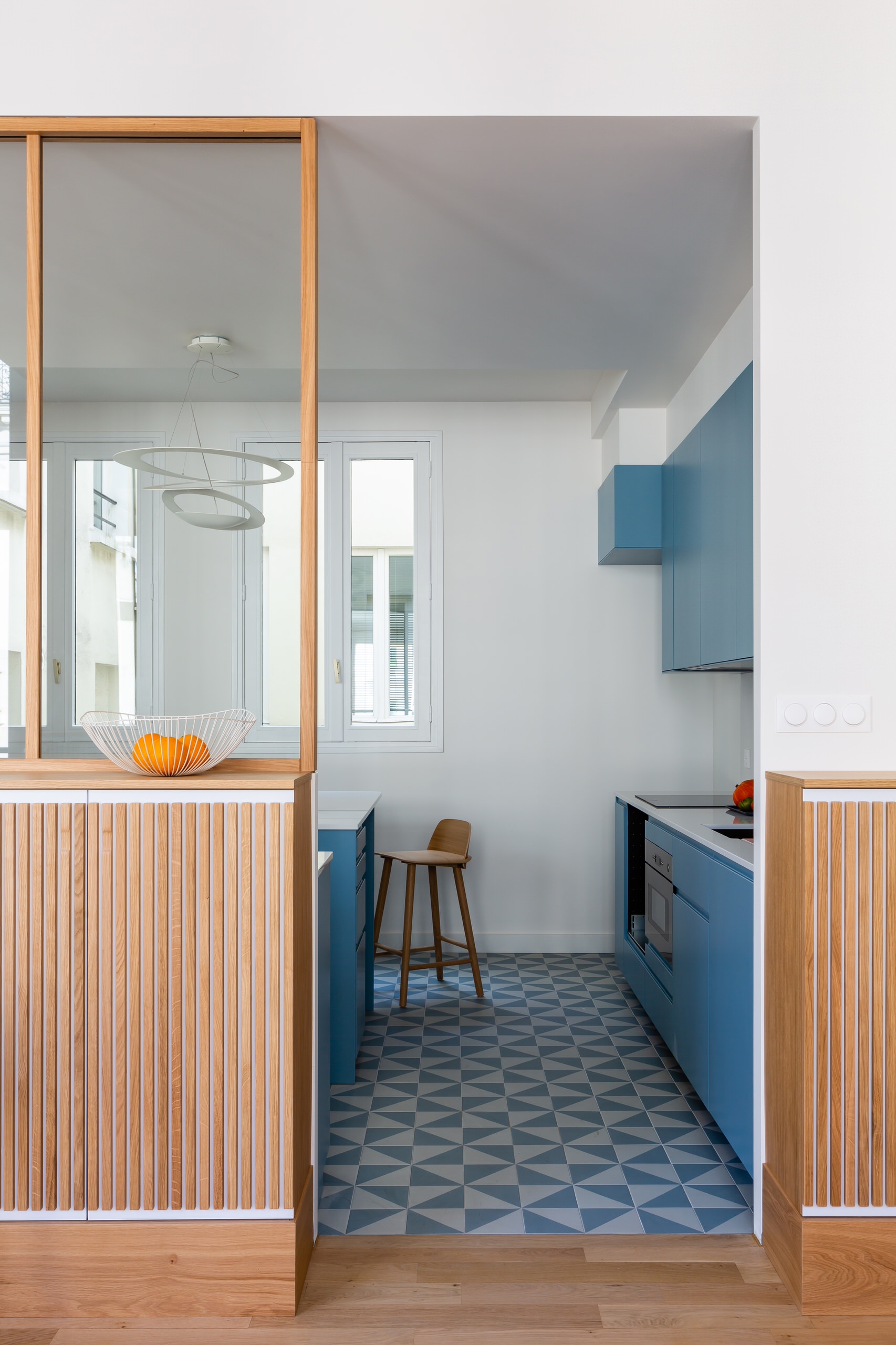 Graphique. En décoration, tout n’est qu’équilibre, et c’est pourquoi il était important, dans ce petit appartement parisien, de contrebalancer la cuisine à la fois graphique et colorée. Avec ce soubassement, habillé de lattes verticales en bois, on apporte une vraie personnalité à la pièce à vivre, mais aussi beaucoup de chaleur.