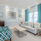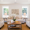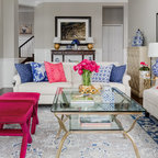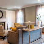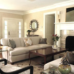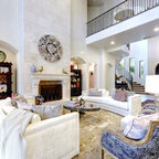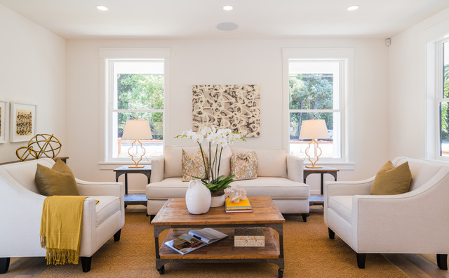 Inspiration pour un grand salon traditionnel ouvert avec un mur blanc, un sol en bois brun, une salle de réception, aucune cheminée, aucun téléviseur et un sol marron. — Houzz