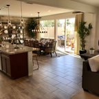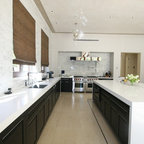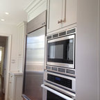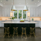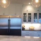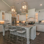 Idées déco pour une grande cuisine classique en L avec un évier de ferme, un placard à porte shaker, des portes de placard blanches, un plan de travail en quartz, un électroménager en acier inoxydable et un sol en bois foncé. — Houzz