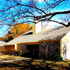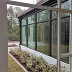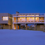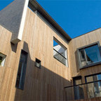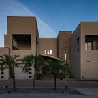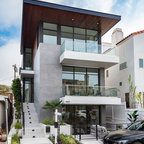 Exemple d'une grande façade de maison multicolore moderne à un étage avec un revêtement en stuc et un toit plat. — Houzz