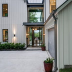 Front façade of stacked boxes with various materials offsets a double height entry, foreshadowing the overlook to the living room