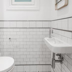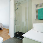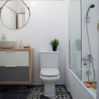 Aménagement d'une douche en alcôve scandinave avec un carrelage jaune, un carrelage métro, un mur jaune et un sol gris. — Houzz