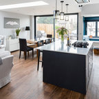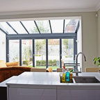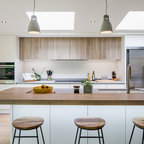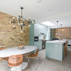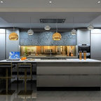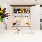 Cette image montre une petite cuisine minimaliste en U fermée avec un évier encastré, un placard à porte plane, des portes de placard blanches, un plan de travail en quartz, une crédence blanche, une crédence en feuille de verre, un électroménager blanc, un sol en carrelage de céramique et aucun îlot. — Houzz
