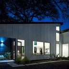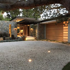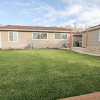 Back yard with raised deck wrapping all elevations with sliding glass aluminum doors. Photo by Clark Dugger