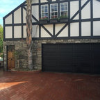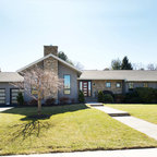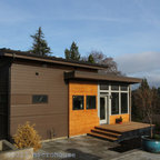 Idées déco pour une façade de maison multicolore rétro de taille moyenne et de plain-pied avec un toit à deux pans et un toit en shingle. — Houzz