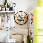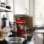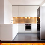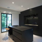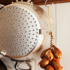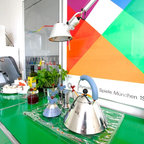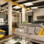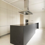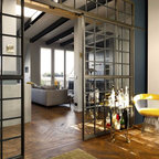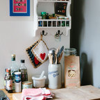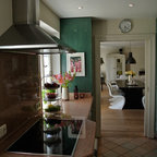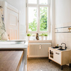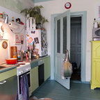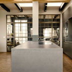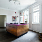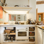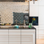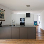 Inspiration pour une grande cuisine ouverte bohème avec un électroménager en acier inoxydable, un sol en bois brun, un placard à porte plane, des portes de placard grises, une crédence grise, un îlot central et un évier 1 bac. — Houzz