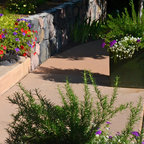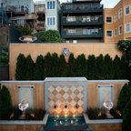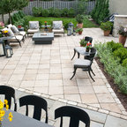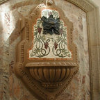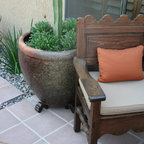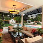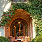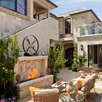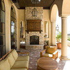 Cette image montre une terrasse et balcon méditerranéenne avec un foyer extérieur. — Houzz