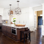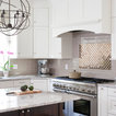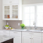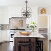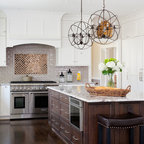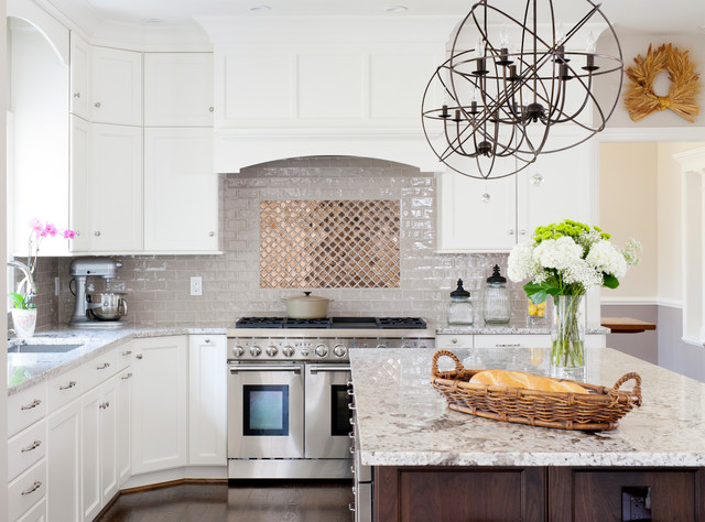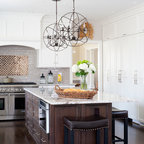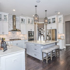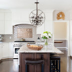Cette photo montre une grande cuisine américaine chic en U avec un évier encastré, un placard à porte shaker, des portes de placard blanches, un plan de travail en granite, une crédence beige, une crédence en carreau de céramique, un électroménager en acier inoxydable et un sol en bois foncé. — Houzz