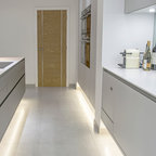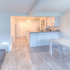 Both flats were designed with neutral colours for the floors and walls with a stylish modern grey and black open plan kitchen installed. The bathroom colour scheme was kept simple and classic with ceramic tiling and white goods.