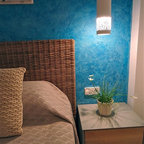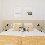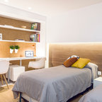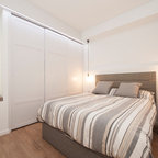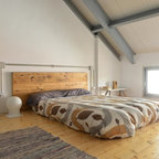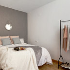 Aménagement d'une chambre parentale scandinave de taille moyenne avec un mur blanc, un sol en bois brun et aucune cheminée. — Houzz