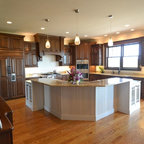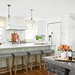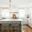 Range with windows on either side, large island with sink, fridge on one end