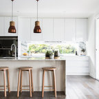 counter seating - cabinets, lightness and openess of kitchen. wood floor