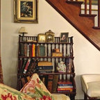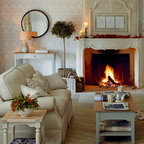 Inspiration pour un salon traditionnel avec un mur gris, un sol en bois foncé, une cheminée standard et un manteau de cheminée en brique. — Houzz