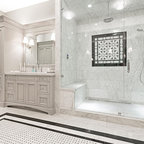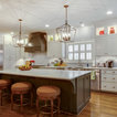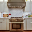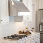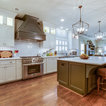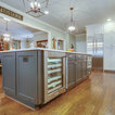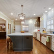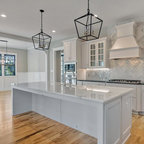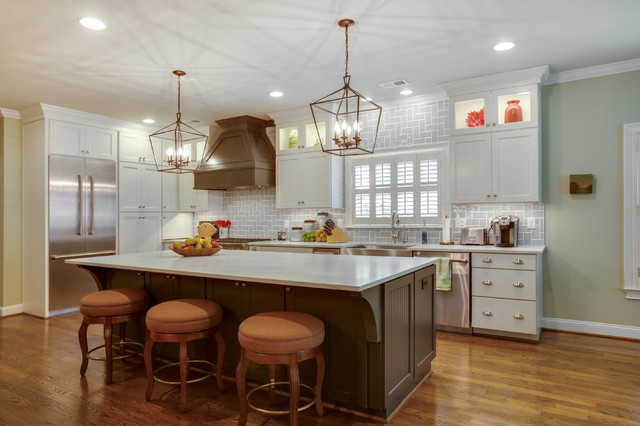 The new design features floor to ceiling Alabaster painted shaker style cabinetry with lighted glass display cabinetry at the perimeter. The 10’ long island comprised of Iron Ore painted shaker cabinets with beaded inlay contrasts beautifully with the perimeter cabinets. Gorgeous Alabama white marble adorns the countertops. The organic beauty of the countertops is highlighted by a backsplash of handmade gray subway in a herringbone pattern and a custom Iron-Ore-painted wood hood that coordinates with the island. This kitchen allows the homeowners to take advantage of all the available space and accommodate their desired approach to entertaining and cooking.