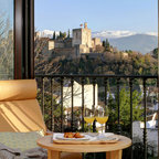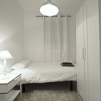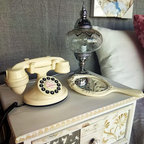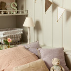 Idées déco pour une chambre d'amis romantique de taille moyenne avec un mur beige, un sol en carrelage de céramique et un sol gris. — Houzz