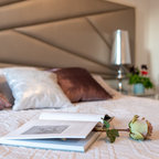 Empapelado con vescom en tonos beige- blanco para la pared del cabecero.