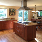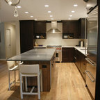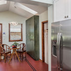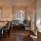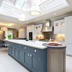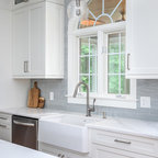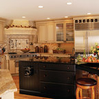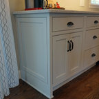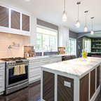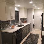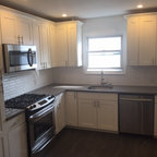 Idées déco pour une cuisine classique en L fermée et de taille moyenne avec un évier encastré, un placard avec porte à panneau encastré, des portes de placard grises, un plan de travail en granite, une crédence beige, une crédence en carreau de porcelaine, un électroménager en acier inoxydable, un sol en carrelage de céramique et un sol gris. — Houzz