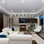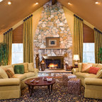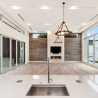 Inspiration pour un salon mansardé ou avec mezzanine design de taille moyenne avec un mur beige, un sol en bois foncé, une cheminée ribbon, un manteau de cheminée en pierre et un téléviseur indépendant. — Houzz