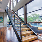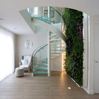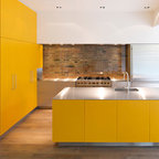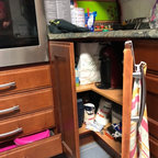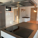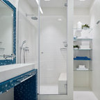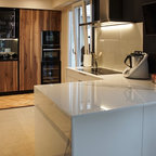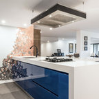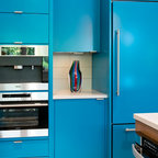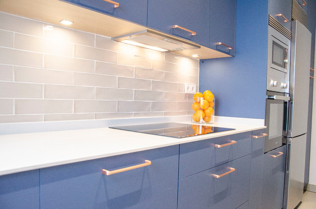 Réalisation d'une cuisine linéaire fermée et de taille moyenne avec des portes de placard bleues, un plan de travail en quartz modifié, aucun îlot et un plan de travail blanc. — Houzz