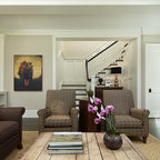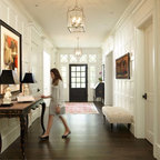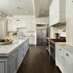 Aménagement d'une cuisine classique en L avec un évier de ferme, un placard avec porte à panneau encastré, des portes de placard blanches, une crédence blanche, une crédence en carrelage métro, un électroménager en acier inoxydable et un sol en bois foncé. — Houzz