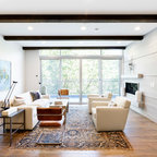 Idée de décoration pour un grand salon minimaliste ouvert avec un mur beige, un sol en bois clair et une cheminée double-face. — Houzz