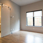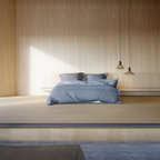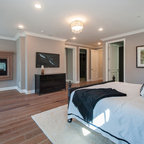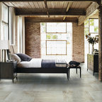 Cette image montre une chambre parentale minimaliste de taille moyenne avec un mur beige, un sol en bois clair, une cheminée standard et un manteau de cheminée en carrelage. — Houzz