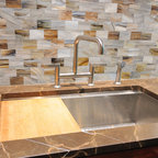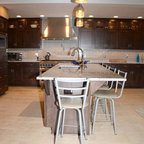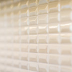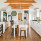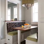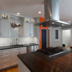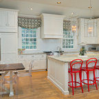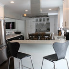 Cette photo montre une cuisine tendance avec un placard avec porte à panneau encastré et des portes de placard blanches. — Houzz