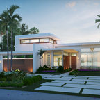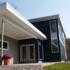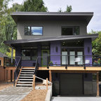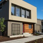 Aménagement d'une façade en bois grise moderne de taille moyenne et à un étage avec un toit plat. — Houzz