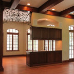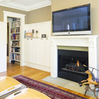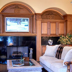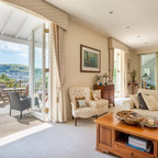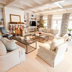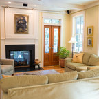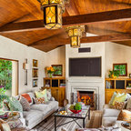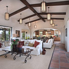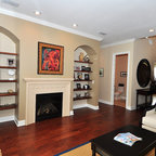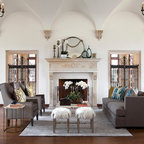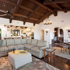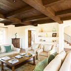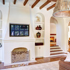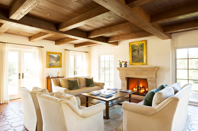 Inspiration pour un salon méditerranéen avec une salle de réception, un mur beige, un sol en carreau de terre cuite, une cheminée standard, un manteau de cheminée en plâtre et aucun téléviseur. — Houzz