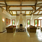 Exemple d'un très grand salon ouvert avec un mur blanc, un sol en bois clair, une cheminée standard, un téléviseur dissimulé et une salle de musique. — Houzz