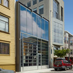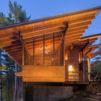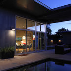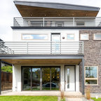 Inspiration pour une petite façade de maison grise minimaliste de plain-pied avec un revêtement en stuc, un toit à deux pans et un toit en shingle. — Houzz