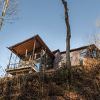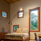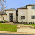 Réalisation d'une petite façade de maison grise minimaliste de plain-pied avec un revêtement en stuc, un toit à deux pans et un toit en shingle. — Houzz