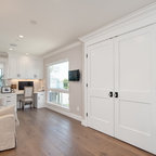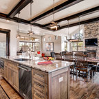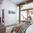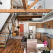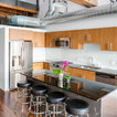 Flat panel kitchen cabinets with quartz counter tops and wood floors/ Polished concrete on entry way, exposed beams and ducting