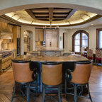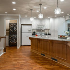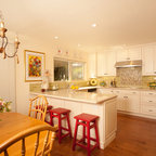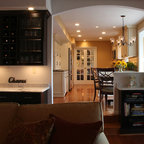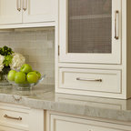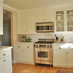 Cette image montre une arrière-cuisine traditionnelle de taille moyenne avec un placard sans porte, des portes de placard blanches, un sol en bois clair, un évier de ferme, un plan de travail en marbre, un électroménager en acier inoxydable et un îlot central. — Houzz