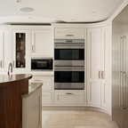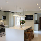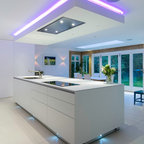 Multiple pendant lights add texture and mood lighting, whilst adjustable spotlights light up key shelves and spots on the island at nightime.