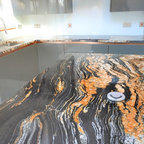 Exemple d'une cuisine ouverte parallèle tendance avec un placard à porte plane, un plan de travail en quartz, un sol en bois clair, des portes de placard blanches et une crédence rouge. — Houzz
