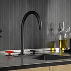 A double height kitchen with rolling library style steel ladder, brings dramatic style to this space.